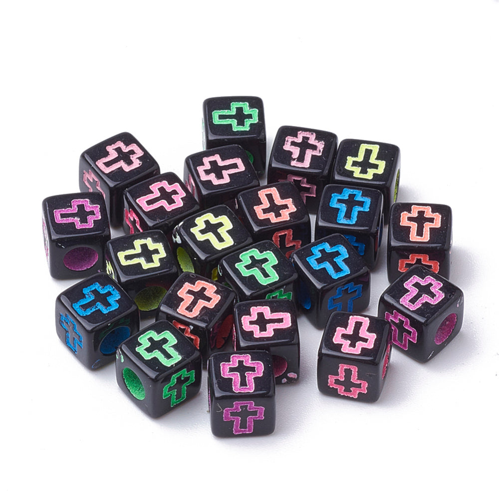 Black acrylic beads in a cube shape with painted cross in mixed colours. Size: about 6mm long, 6mm wide, 6mm...