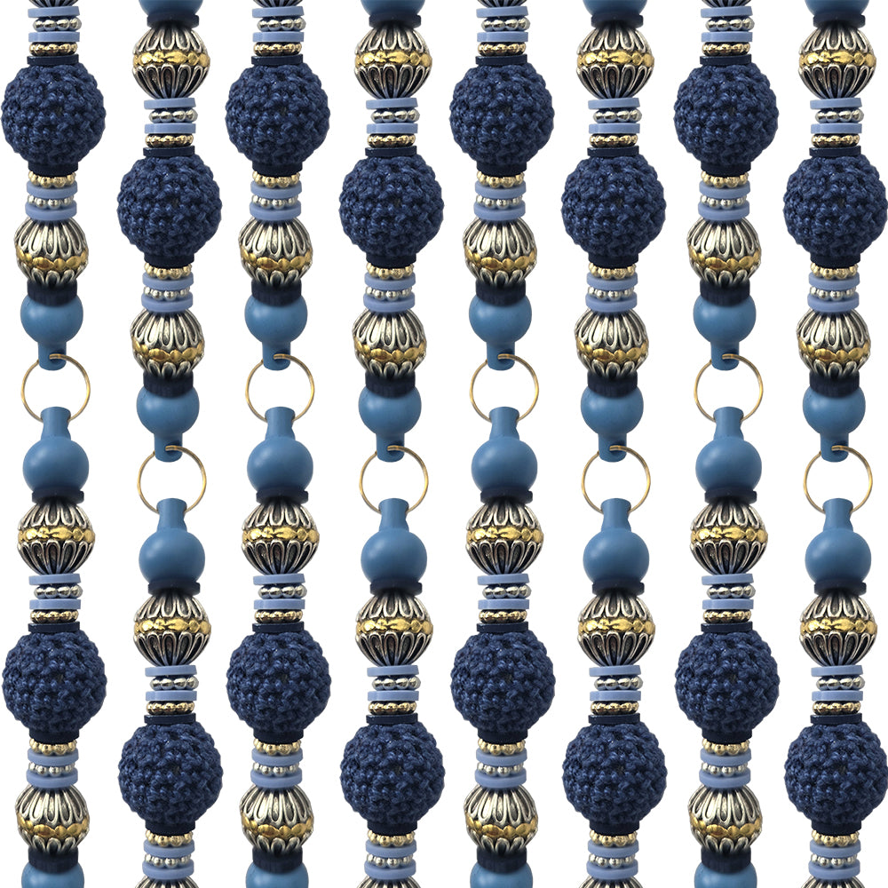 Contrasting shades of blue come together in this elegant design using woven balls of blue with adjacent metal looking balls...