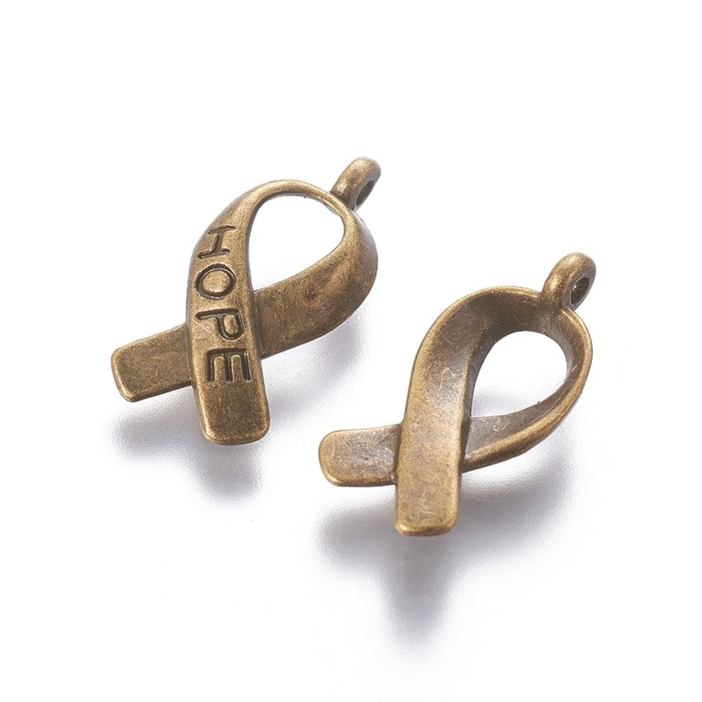 Breast cancer awareness ribbon with carved word "Hope". Tibetan style alloy message Pendants in antique bronze. Size: about 19mm long,...