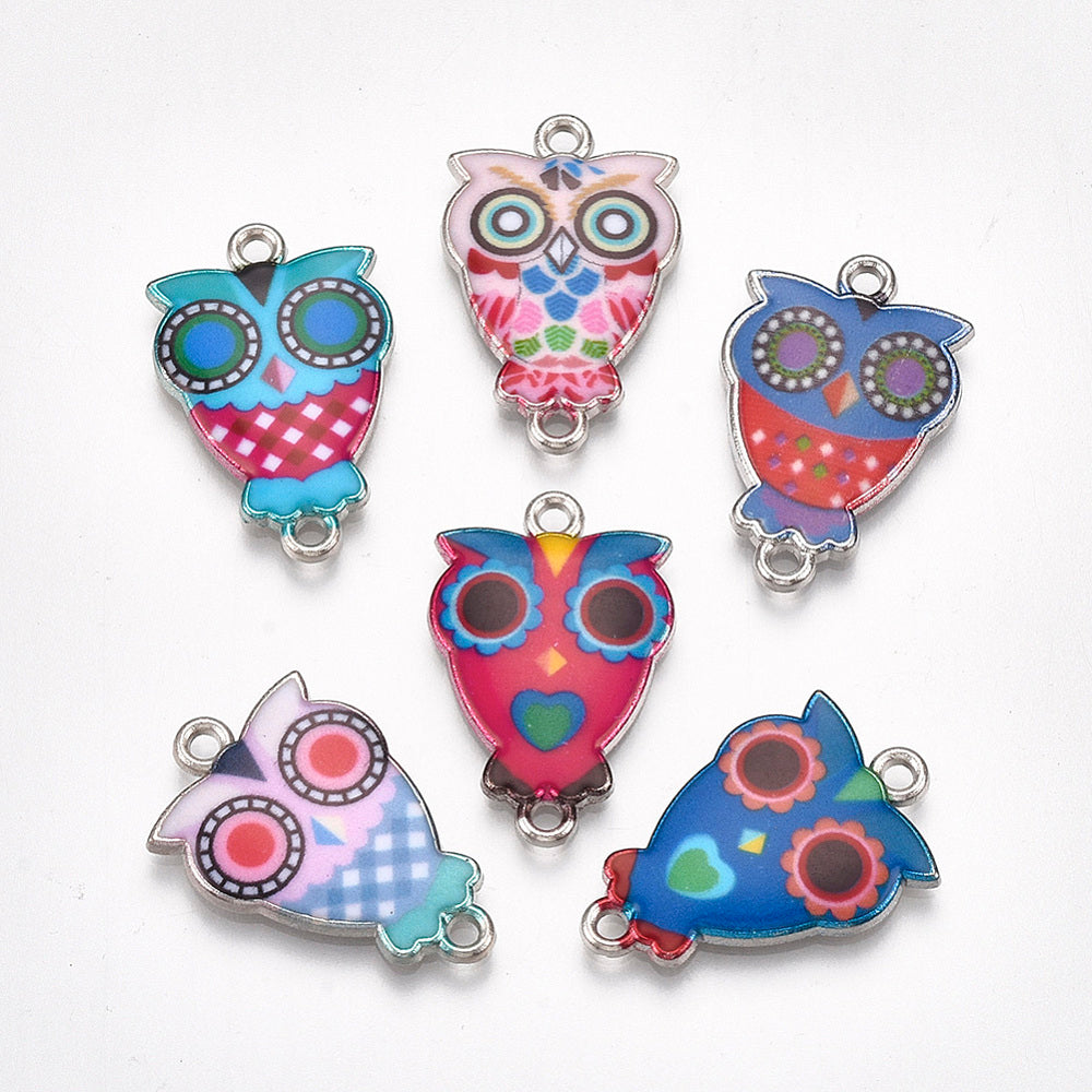 Alloy link connectors in the shape of enamel owls in mixed patterns. Size: about 25mm long, 16mm wide, 2.5mm thick...