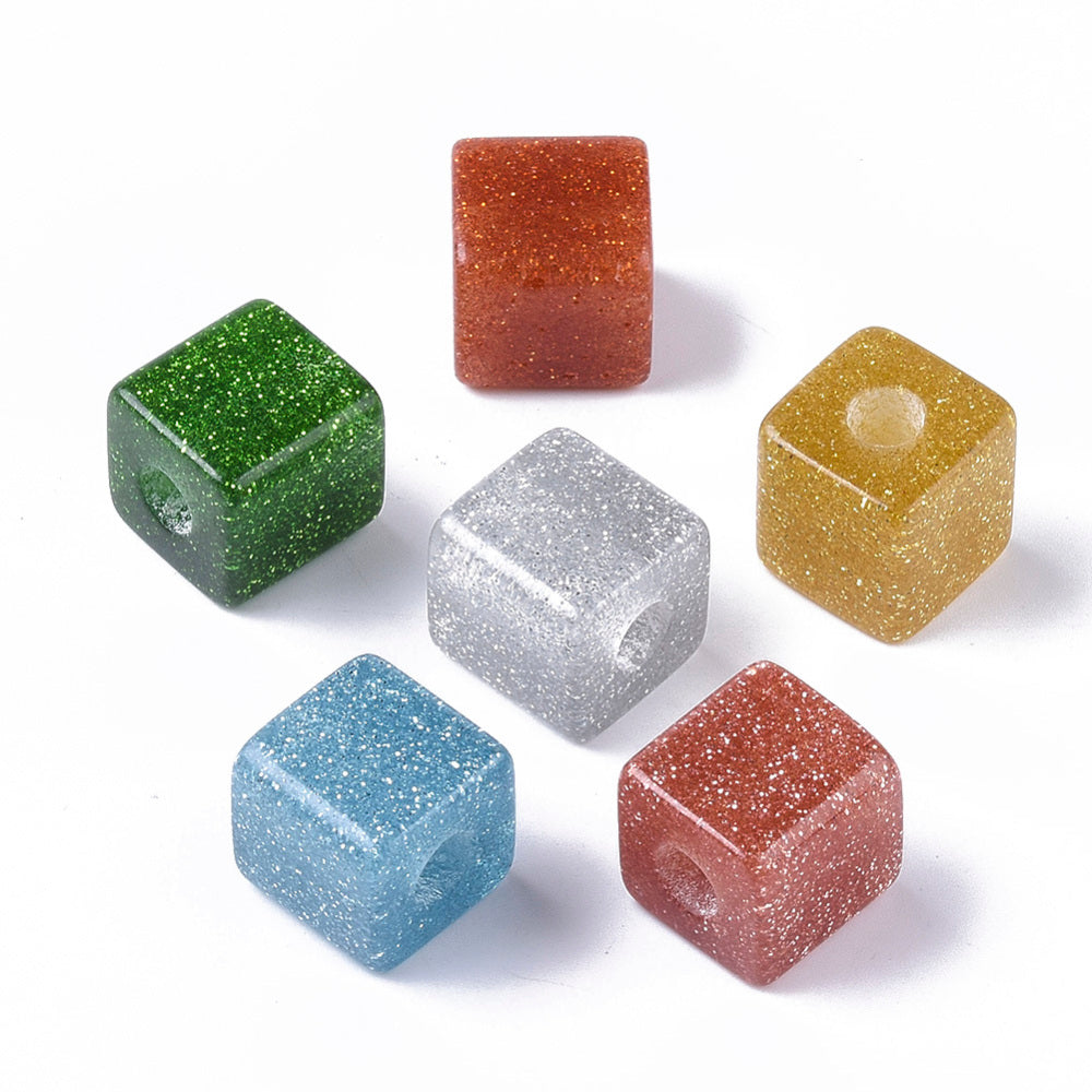 Glitter resin beads in the shape of cubes in assorted colours. Size: about 16mm long, 16mm wide, 16mm thick Hole:...