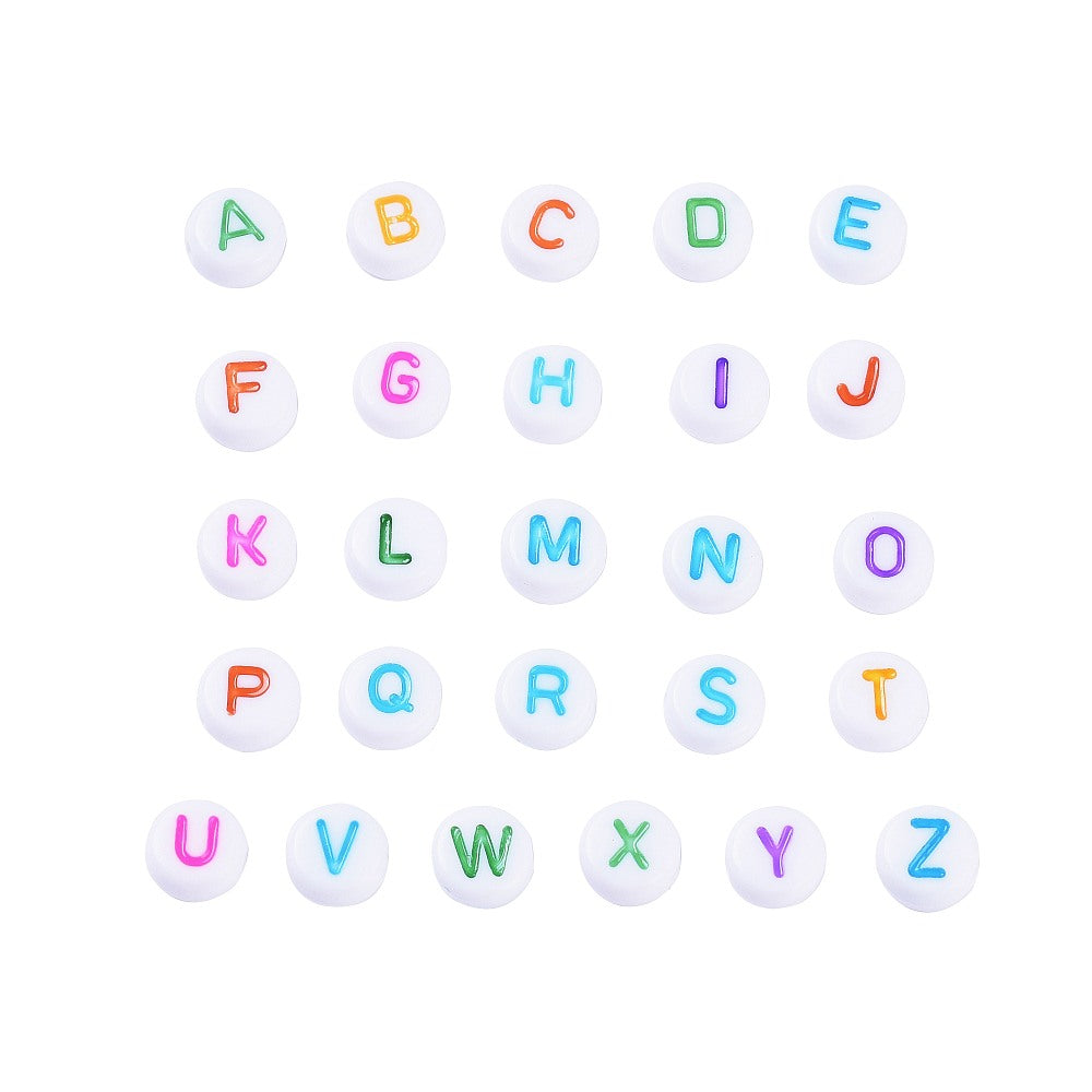 Set of 26 letters in mixed colours of white acrylic beads. Size: about 7mm in diameter, 3.5~4mm thick Hole: 1.2mm...