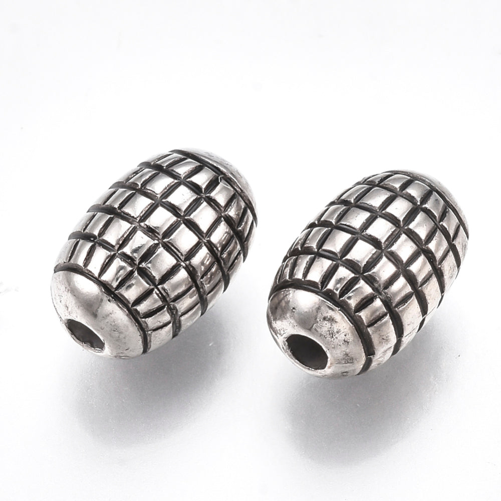 Oval CCB beads with net pattern in antique silver. Size: about 11mm long, 7.5mm in diameter Hole: 1.5mm Sold individually....