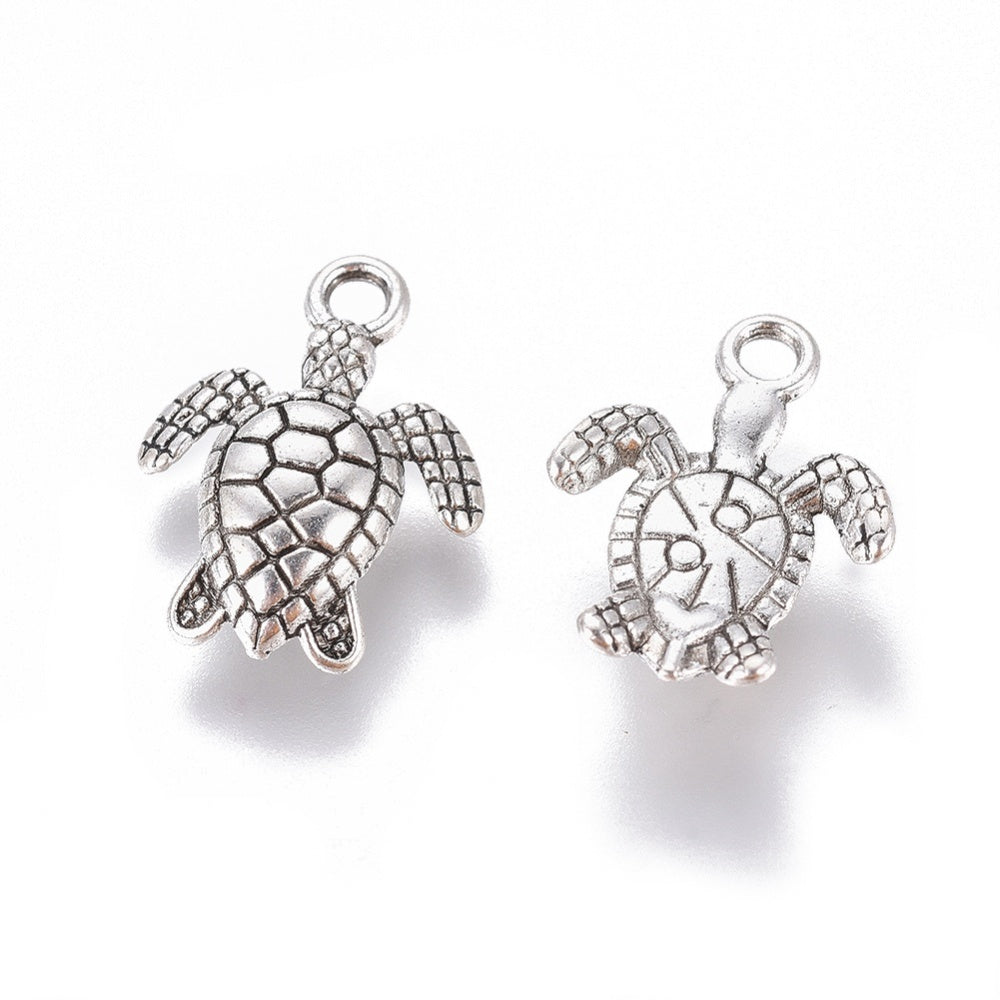 Alloy turtle pendants in antique silver. Size: about 16mm long, 13mm wide, 3mm thick Hole: 1mm Sold individually. Learn about...