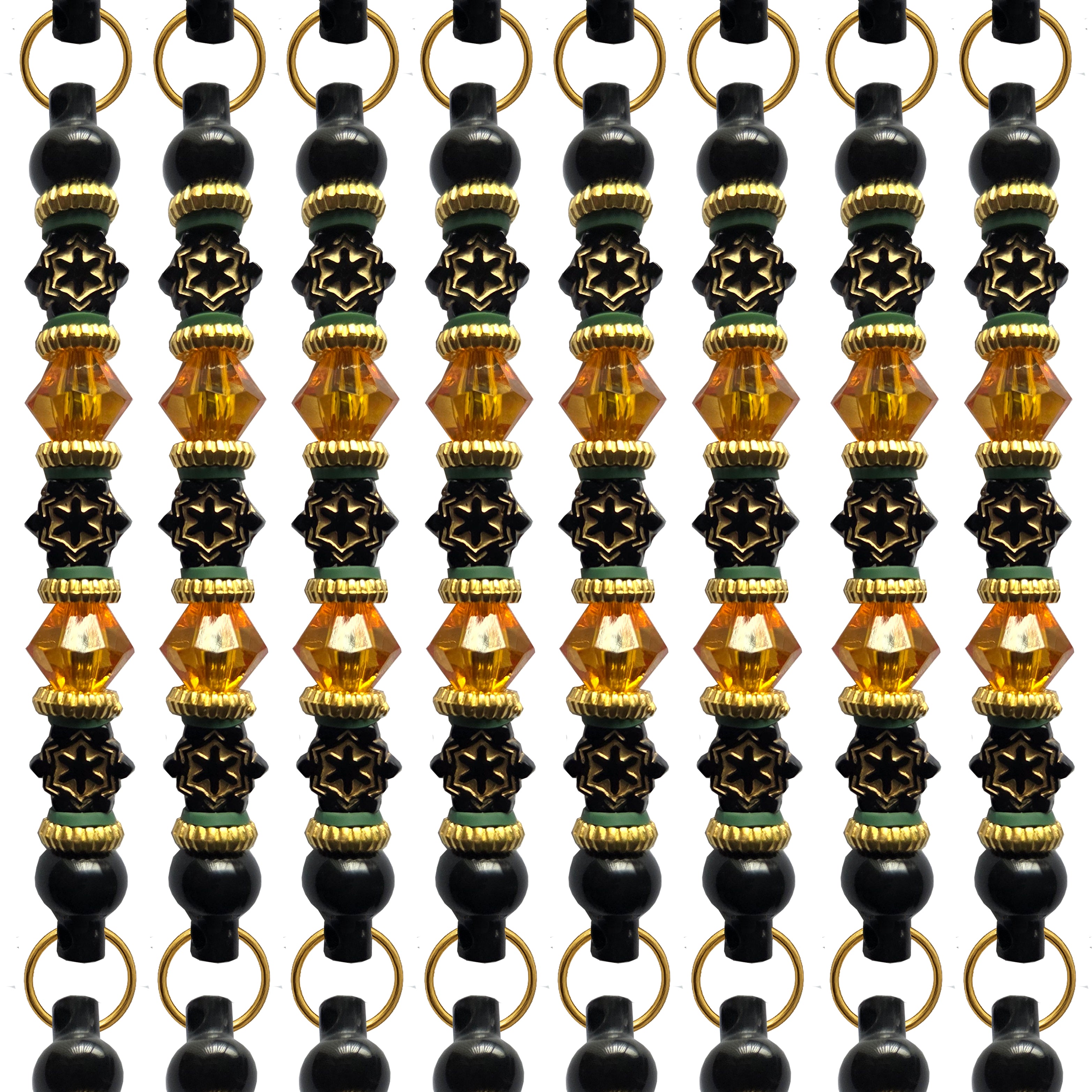 Carefully selected tribal inspired wooden beads in a star shape laced with gold. Perfectly contrasted with cone shaped amber clear...